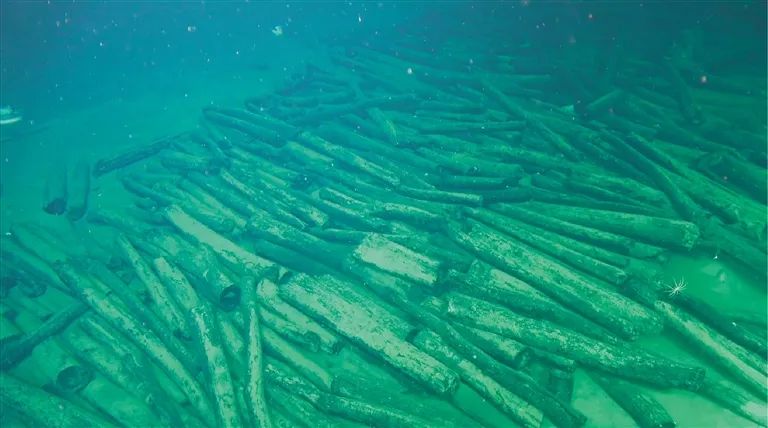另一处遗址发现大量原木,尺寸相近、码放整齐,大多经过简单加工,初步研判沉船是从海外装载货物驶往中国的古代船只,年代约在明代弘治年间(1488年—1505年),定名为南海西北陆坡二号沉船。 4 I5 ~4 p% h, r/ o& p