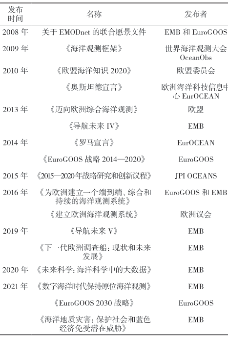 欧盟十分重视对探测观测体系的整体谋划和规划,通过发布战略和规划等方式,加强对各个平台、相关组织的统筹协调。以智库平台EMB为代表,自2001年起发布《导航未来》系列战略报告,以及欧洲调查船、海洋地质灾害等战略报告,提出未来发展方向和相关路线图来推动各领域发展。此外,其他机构也先后发布有关海洋探测观测的战略或实施计划(表1),这些具备科学性、前瞻性的战略和计划,引领欧洲海洋探测观测各领域发展,使欧洲一直处于海洋探测观测前沿。