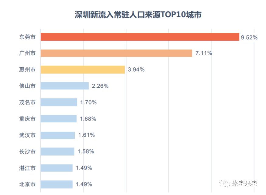 : X$ }. l1 x; T( r( s6 ^4 } 深圳市2017年新流入常驻人口来源TOP10城市有6个为省内城市,其他四个城市分别是重庆、武汉、长沙、北京,且深圳新流入人口来源TOP10城市流入人口占总 流入人口比例为32.4%。 ' q8 J$ z* B+ y0 ^