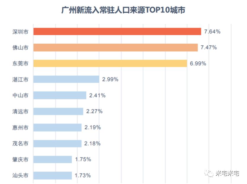 但广州市2017年新流入的常驻人口来源TOP10城市全部位于广东省,其中排名前三的城市分别是深圳、佛山和东莞。而这很大程度上还是因为和深圳相比,虽同为一线城市,但广州房价只有深圳的一半。 5 `7 b8 Q% F( W# G