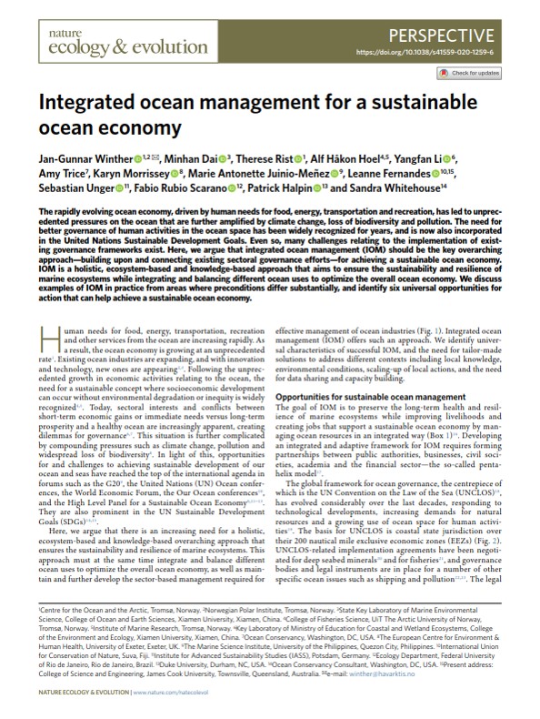 2020年8月17日,《自然•生态学与进化》(Nature Ecology & Evolution) 杂志发表由挪威海洋与极地研究中心Jan-Gunnar Winther教授与厦门大学近海海洋环境科学国家重点实验室、海洋与地球学院戴民汉教授等人撰写的论文《Integrated ocean management for a sustainable ocean economy》,探讨海洋可持续经济发展面临的重大挑战,提出海洋综合管理的步骤和指导原则,阐明未来行动契机。 ) [/ F. Q: V) E# R