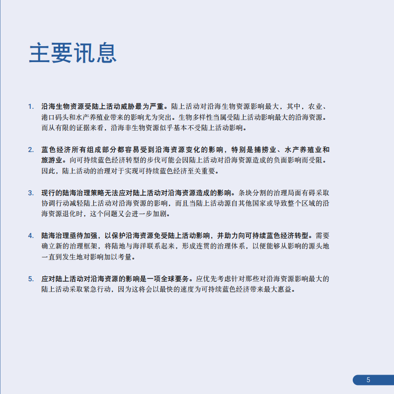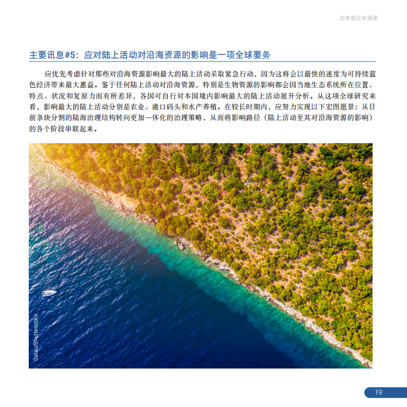 5 E0 z- G I0 v5 b, X 报告表示,陆上活动对沿海生物资源影响最大,其中,农业、港口码头和水产养殖业带来的影响尤为突出。基于海洋的蓝色经济所有组成部分都容易受到沿海资源变化的影响,特别是捕捞业、水产养殖业和旅游业。向可持续蓝色经济转型的步伐可能会因陆上活动对沿海资源造成的负面影响而受阻。因此,陆上活动的治理对于实现可持续蓝色经济至关重要。