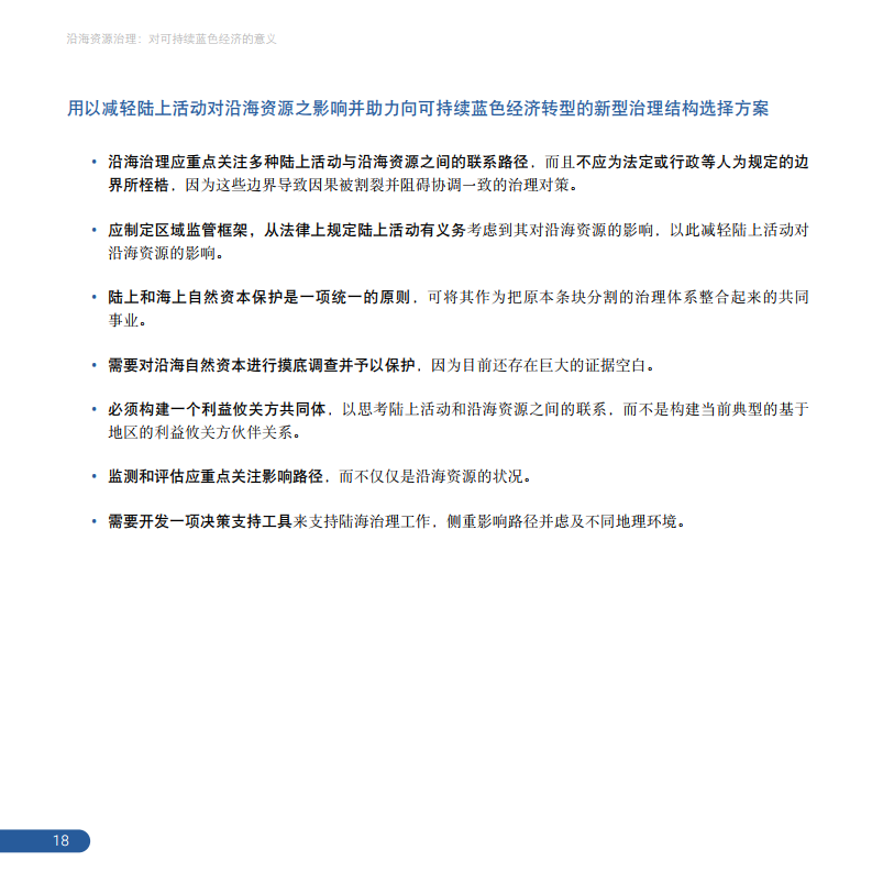 $ M( a: ?1 k3 G- H2 H& q 报告为政策制定者提供了如何加强现有陆海治理结构的具体方案,以及关于陆海资源治理策略提供了新见解。报告表示,各国应以基于生态系统的管理作为沿海资源治理的指导原则,这样便可以通盘考虑沿海资源承受的所有影响,并利用经过改进和调整现有区域管理工具来应对陆上活动对沿海资源的影响(如海洋保护区、海洋空间规划、土地利用综合规划和沿海综合管理)。陆上和海上自然资本保护是一项统一的原则。沿海治理应重点关注多种陆上活动与沿海资源之间的联系路径,并制定区域监管框架。