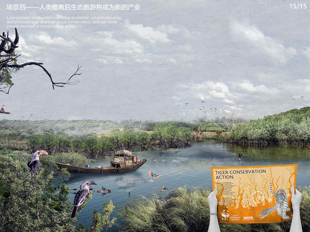 为了应对气候变化,红树林会适应性的向内陆迁移,策略思考了人类与其他物种的关系,通过跳棋的规则来解释这一过程,将红树林比作棋子,想要向前移动需要一个棋子作为跳板。人类在发展生产的同时可以为红树林创造一颗跳板“棋子”,帮助红树林向内陆迁移。在未来随着人类不可避免的撤退,这些边界区域的人工景观,如大坝和农田,将成为限制红树林迁移的障碍。该策略考虑了帮助同为气候难民的动植物的撤退,结合策略A\B创造的生态斑块(林带、边界的红树林),可以充当区域景观中的走廊或“踏脚石”,为一系列物种提供迁徙路径,加快了人工景观向自然景观的演替速度,保护了孙德尔本斯和老虎免于在气候变化的冲击下消失。