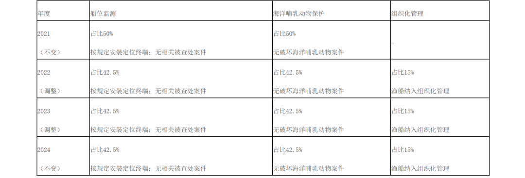 一是将海洋大中型捕捞渔船(12米以上)负责任捕捞补贴指标比重系数统一设定为进出港报告、船位监测、渔捞日志、定港上岸、海洋哺乳动物保护、组织化管理各占相应补助类型负责任捕捞补贴总额的15%、幼鱼比例占负责任捕捞补贴总额的10%。