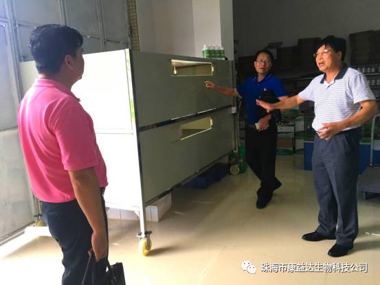 ▲严副局长、罗副局长、梁科长和董博士等,边参观边商量如何扶持金湾区农户利用龟箱和室内闲置空间养龟致富。 R4 L: d- n3 m" R; V8 z