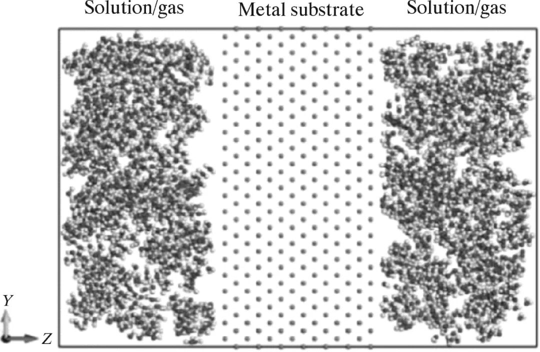 ' F4 c R/ X/ ]* Q Fig. 4 Schematic diagram of solution/gas metal surface-solution/gas reaction model 2.3 金属表面-溶液/气体反应模型图5为金属表面-溶液/气体反应模型的示意图。在该模型中,溶液/气体中的原子与金属不同表面取向的表面(单面)直接接触反应,如图5所示,在图5的左边固定一部分金属基体,在图5的右边一定距离处设置一个反射墙,在两端分别预留一定距离的真空。这种设置的目的是让Z方向展现为非周期性。DorMohammadi等[37]使用金属表面-溶液/气体反应模型研究了铁基体不同的表面取向的表面与纯水的反应,采用分子动力学的方法模拟了铁基体在纯水中腐蚀的初始阶段。 / W! }- B- V) y9 b! [