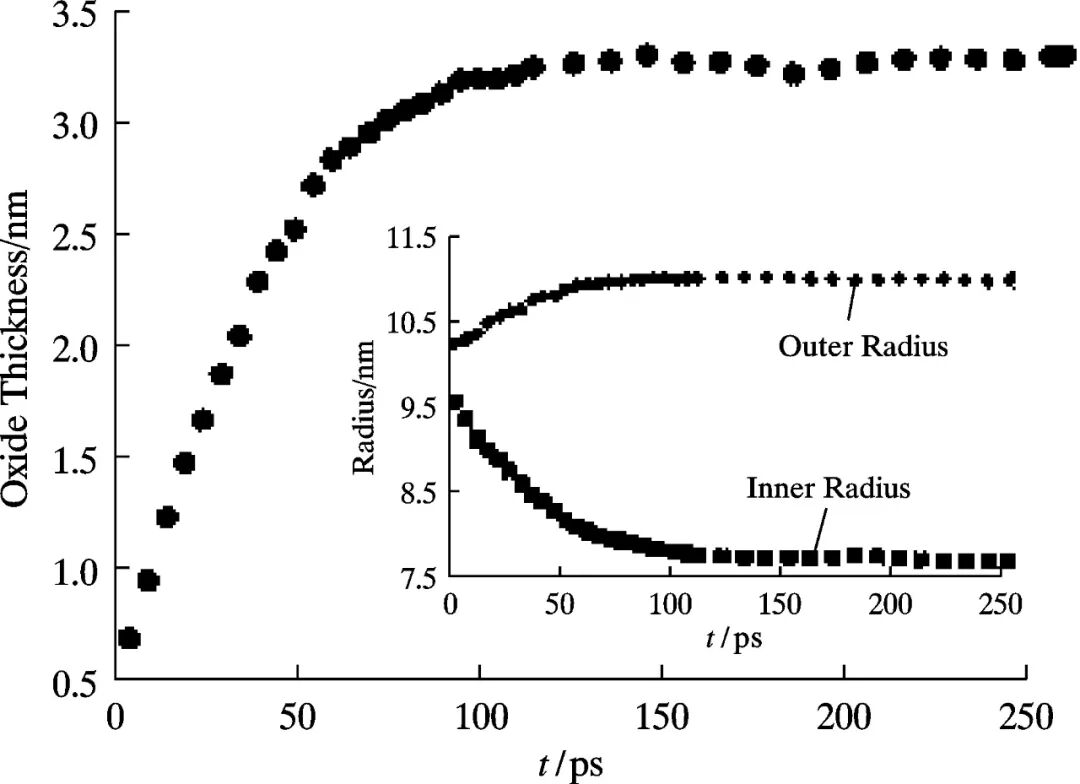 Fig. 1 Variation of oxide film thickness with time[24] 1.2 ReaxFF势函数反应力场(ReaxFF)是专门设计出来描述化学反应性、化学键的断裂和形成、表面、缺陷、扩散等的一种特殊类型的力场[25],它同时考虑了非键合和键合的能量函数。它通过能量描述化学键,有着较高的计算效率,弥补了量子化学方法和传统分子动力学之间的差距[25]。ReaxFF原子间势能函数定义为[25,28,29]:Esystem=Ebond+Eover+Eunder+Eval+Etor+Elp+EH-bond+Evdwaals+Ecoulomb (6)式中:Esystem表示系统的总能量,Ebond、Eover、Eunder、Eval、Etor、Elp、EH-bond、Evdwaals和Ecoulomb等能量项分别对应键能、欠配位的能量矫正项、过配位的能量矫正项、价角能、扭转角能、孤对能、氢键能、范德华能和库仑能。最后两个能量项范德华能Evdwaals和库仑能Ecoulomb计算所有原子对,而其他所有能项均由计算粒子i和j之间的键级获得。原子电荷是使用与几何有关的电荷分布来计算的,该分布通过电荷平衡法确定[30,31,32]。单个原子电荷和静电能E(q)随时间动态地变化。相应的静电能E(q)定义为:E(q)=Νi=1[wiqi+uiq2i+Τap(rij)Κc] (7)式中:qi是离子i的电荷;N是离子的总数;q是电荷长度N的矢量;wi和ui分别是离子i的电负性和硬度。Tap(rij)是一个七阶锥度函数,当带电粒在非键合截止半径内或外移动时,避免能量不连续;Kc是介电常数;rij是原子i和j之间的距离。原子电荷与系统的几何位置有关,在每一时间步上都进行计算。Nabankur等[33]利用ReaxFF分子动力学模拟研究了阳离子Li+、N a+、K+和阴离子Cl -对水的结构和动力学特性的影响,且已经成功地描述了这些系统固有的化学反应和扩散行为,能够将氢键动力学的定性趋势与不同体系的物种分布联系起来,使得其他电解质-水系统和热力学状态的模拟成为可能。Gabriele等[34]通过ReaxFF描述了银-氧和银-硫反应机理,Ag-O和Ag-S的反应快照如图2所示。
