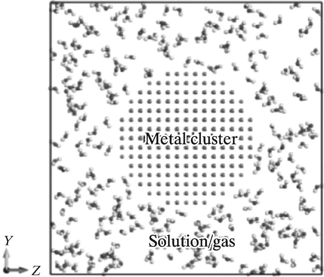 2 金属腐蚀分子动力学模拟模型 建立合适的金属腐蚀分子动力学反应模型是得到正确和可靠的模拟结构的首要条件。目前用于金属腐蚀的分子动力学模拟的反应模型主要有3种,分别为金属团簇-溶液/气体反应模型、溶液/气体-金属表面-溶液/气体反应模型和金属表面-溶液/气体反应模型。2.1 金属团簇-溶液/气体反应模型图3为金属团簇-溶液/气体反应模型的截面示意图。在该模型中,溶液/气体中的原子与金属团簇表面直接接触反应。Li等[35]使用金属团簇-溶液/气体反应模型研究铝团簇与水分子的反应,采用分子动力学的方法模拟了不同数量的水分子与铝团簇的反应行为。