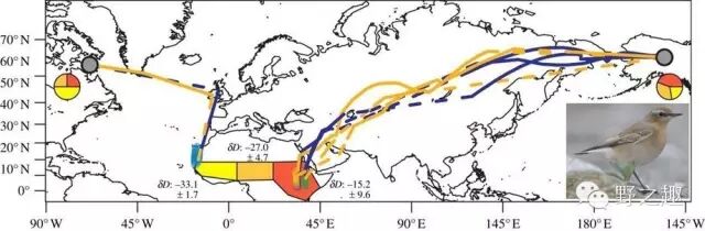 * J; A) r. c/ t# q( y 繁殖地在阿拉斯加的穗鵖(Oenanthe oenanthe)和繁殖地在加拿大东部的穗鵖的迁徙路线。其中: : _3 @: Z7 a+ T) A3 B3 w
