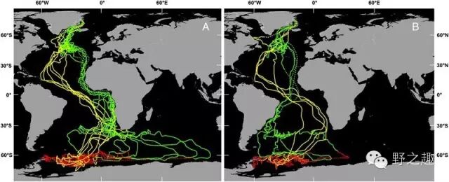 - C6 G& {+ v+ e B2 o" g 繁殖地分别在格陵兰岛(10只)和冰岛(1只)的北极燕鸥的迁徙路线。