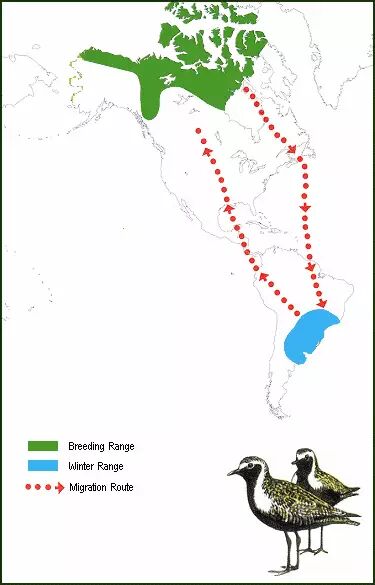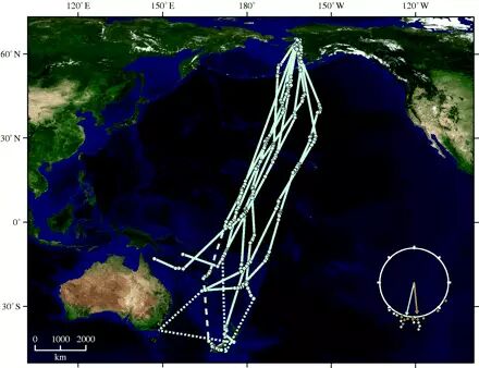 论文中提到了美洲金斑鸻等鸟类,采用了南迁与北迁不同的路线策略,似乎形成了一个顺时针的圆圈。 / O2 h! c0 e X3 b