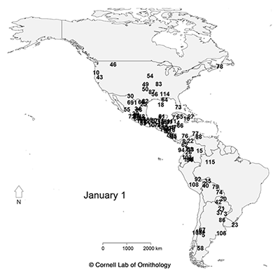 1 u, _" ]+ v4 B5 z1 R" t, b 2016年1月20日,《皇家社会学报B 生物科学》发表了康奈尔大学鸟类学实验室的La Sorte, F.A., D. Fink, W.M. Hochachka, and S. Kelling等科学家记录鸟类迁移的研究论文,该项研究涵盖了西半球118个鸟类物种在一整年中的运动轨迹,并在地图上运用演示动画显示其每个物种的年度周期运动模式。 % f5 F" B8 a! K9 F
