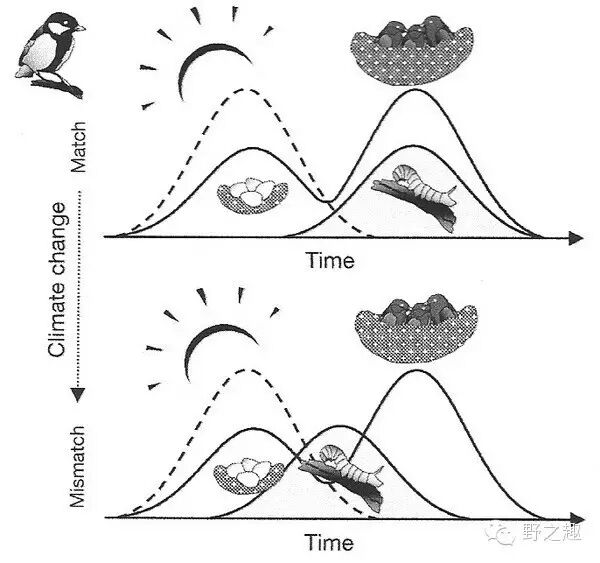 2 j3 |( d4 k. K% [( k 论文中还谈到了鸟类迁徙与气候变化的相互关系。可能这张图让人会感到十分直观。由于气候变暖,作为鸟类主要食物的昆虫爆发期提前,而仍然遵循老观念的鸟类,到育雏时就会面临无食可觅的窘境。 - t( ` e( b. F9 O" v# L