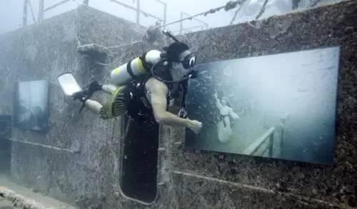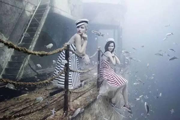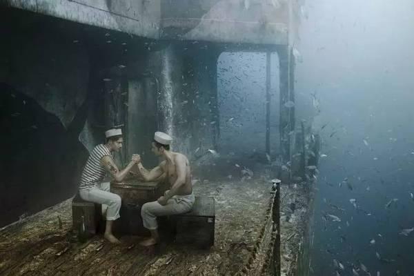 0 U8 D$ i* n' @. e" O1 q- P, U 弗兰克让潜水者用12块强力磁铁把拍摄的超现实摄影数码照片吸附在长93英尺(约28米)的船舷上,这些照片外有3毫米的树脂玻璃封住,装裱在不锈钢的铁框上,再用硅树脂密封防水。而这些画作的内容究竟是什么呢?