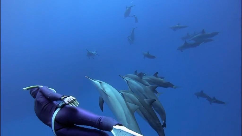 “当你潜水中,在毫无准备的情况下偶遇大鲸。它宽大的后背就像火车一样划出水面,紧接着是一个漂亮的甩尾。你会如何?整个人都会幸福地傻掉了!”这是自由潜水教练Ber在水中见到的最炫酷的东西。当时她与鲸只有不到20米的距离,她说,当时鲸游走了,她与学生们还只是呆呆地趴在浮球上感叹大海的美妙。
