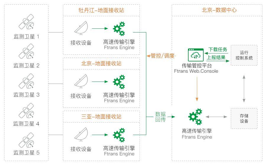 Ftrans企业级高速传输系统是由飞驰传输自主研发的分布式大容量数据资源智能传输软件系统,其主要作用是在分布式网络环境中,尤其是跨区域的广域网络中,克服网络带宽有限、网络状态不够稳定、原始数据来源有限等问题,在不同的应用或存储节点之间快速、稳定地共享、分发和传输大容量文件数据。通过高速引擎技术、高速传输协议技术、传输管控平台等自有研发的核心技术建立了卫星海洋通讯行业数据传输领域中的全新方向和解决方案。 在北京、三亚、牡丹江三地海洋卫星地面接收站各部署一套Ftrans Engine传输引擎,通过引擎内部的 CUTP高速协议、将预处理系统接收的海洋卫星信号数据进行高速并行的传输,实现数据100%的正确传输。系统对海量数据小文件进行虚拟拼接,传输后进行校验,在传输网络出现波动时可自动启用错误重传、断点续传的策略,保障数据传输的高可靠性;启用加密传输策略,在卫星地面接收站和总中心两端建立安全传输通道。Ftrans系统采用了金融级的秘钥交换机制和数据加密算法,在传输的过程中保障了数据的完整性和安全性,降低了数据在网络传输过程中被意外截获的风险;在北京海洋卫星地面接收站总中心部署一套Ftrans Web.Console管理平台,统一管理 各个接收站的Ftrans Engine传输引擎,同时与运控系统做集成,进行传输状态的监控和传输调度管理。管理运维人员通过登录Ftrans Web.Console管理平台,可对当前数据传输任务的状态、进度等信息进行数字化、图形化的直观查询;通过策略配置,对文件进行自动探测,按照文件生成顺序进行标号,001、002……999,在信号数据还在接收过程中即对开始的批次文件启动至总中心的传输任务,实现每间隔一分钟后的传输任务处理,大幅度的提高卫星数据的实时性;通过系统接口的集成,对业务系统中要求精度更高的数据进行自动的通知、调度。总部需要时下发传输指令,地面接收站在指定的时间启动传输任务,自动的将本地保存的完整性数据进行回传,过程更加智能化;对现有的数据传输流程进行自动化配置,数据传输过程的问题,业务系统都会自动触发策略,运维管理人员对此可配置邮件通知策略。系统监控到异常情况,即进行日志的记录并启动策略邮件通知管理员,便于运维管理,使卫星地面应用系统更好地运行。3、方案特性