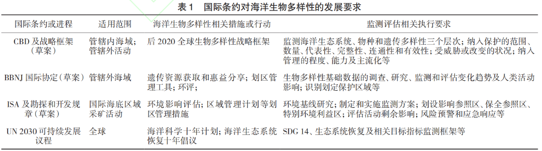 " J+ g( i1 o2 X# ?3 E. u5 N 《联合国海洋法公约》和《生物多样性公约》两大国际公约体系,以及其他针对特定生物多样性组成部分、特定领域和区域的法律文书,都相应确立了国家报告、信息共享、监测及审查等执行机制及履约要求。当前正在制定的BBNJ国际协定、CBD2020年后全球生物多样性框架和国际海底区域矿物资源开采规章,以及促进联合国2030年可持续发展目标的新十年计划等一系列前沿进程,对海洋生物多样性的调查、研究、监测观测、保护和管理提出了新的发展要求(表1)。 海洋生物多样性其他热点问题 01海洋遗传资源