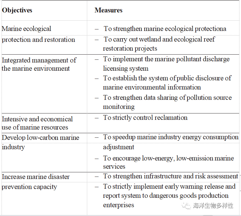 为落实这些指导思想,国家海洋局印发了《国家海洋生态环境保护规划(2017-2020年)》。这一更新后的规划以生态导向为原则,突出了生态本位和全面性。海洋governance.30《规划》任务安排涉及构建绿色发展格局、加强海洋生态保护、推进海洋环境修复、加强陆海污染联防联控、防控海洋环境风险、推进海洋生态环境监测等6个重点领域,涵盖海洋治理全过程。这些任务安排都是以保护为主、促进海洋经济结构优化为导向的。高度重视将生态系统的保护从目前分散和分散的制度转变为集中一体化的制度。加强海洋生态保护,重点抓好完成《海洋生态目标图》编制、海洋保护区网络建设、海洋生物多样性养护、岛礁生态环境保护等四项重点工作。