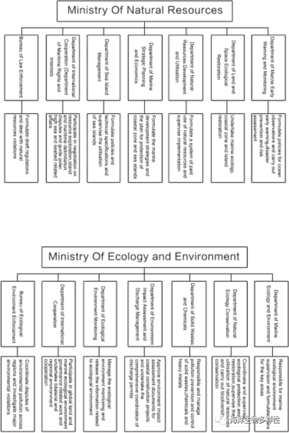 4 g- r6 Q% {7 n. a, Z; o% b9 m 图2 自然资源部和生态环境部属下负责海洋资源和环境管理的部门