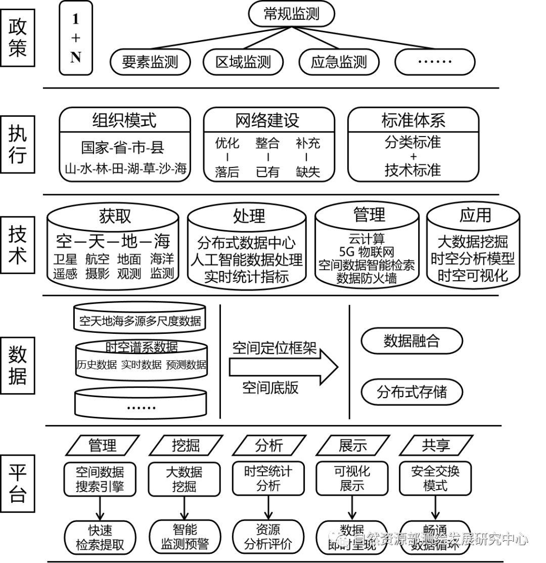 只有整合形成山-水-林-田-湖-草-沙-海多门类、国家-省-市-县多层级的综合监测体系,才能实现自然资源监测从分散治理到统筹管理的转变,而这涉及组织模式、网络建设、标准体系等多方面的落实推进。首先是要按照中央与地方的权责划分,明确各级部门任务分工,构建分级监测机制,统筹分工监测任务,做好业务体系的整合与重构,建立健全覆盖各资源门类的国家-省-市-县四级分工协作的组织模式,并适当引导社会力量参与,鼓励地方因地制宜开展试点研究,推广可复制的成熟做法,例如国家地下水监测工程,采用多级数据共享与异地联动工作模式,全面实现数据纵向联通,达成数据联动。其次是要统一规划监测体系。优化落后的基层监测站点资源,整合重构已有的监测站点,补充缺失的监测点位,提高监测系统的通用性,避免重复建设,建设覆盖各自然资源类别的综合监测体系。例如水利部、自然资源部和生态环境部已就水资源调查监测的工作思路和方案基本达成共识,统一地表水和地下水的资源量及质量调查评价监测,构建标准统一、分工明确的整体体系。再次是要执行通用的标准体系。统一自然资源分类标准,融合已有指标体系,最大程度地整合不同监测体系之间的数据,达成资源数据的不重不漏,例如国家林草局已开展林地、草地、湿地数据与第三次全国国土调查数据对接融合,统一林地、草地、湿地调查监测的界限范围。统一自然资源监测标准体系,构建多源数据获取-处理-质检-管理-分析全流程技术体系,明确监测指标内容,减少重复监测。 6 T" U, y9 f- O4 o; N$ O7 P+ |