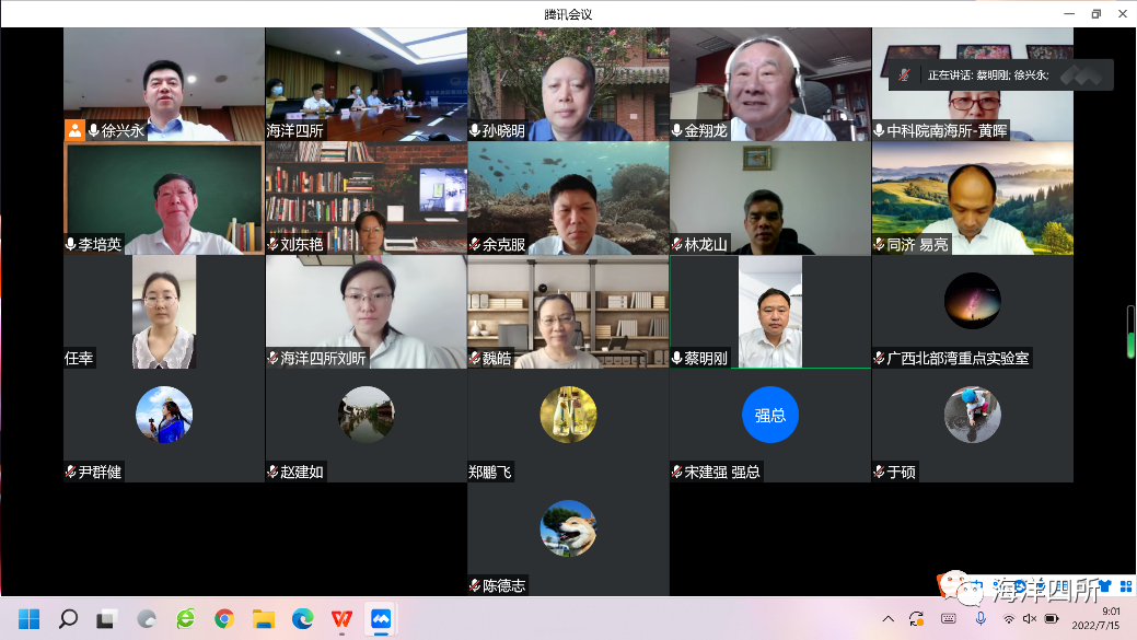 2022年7月15日,广西北部湾海洋资源环境与可持续发展重点实验室举行第一届学术委员会第一次会议在北海顺利召开,会议采用线上与线下结合的方式举行。 实验室学术委员会主任自然资源部第二海洋研究所金翔龙院士,副主任自然资源部第一海洋研究所李培英研究员,委员中山大学孙晓明教授、华东师范大学刘东艳教授、广西大学余克服教授、广西精工海洋科技有限公司宋建强总经理、自然资源部第三海洋研究所林龙山研究员、同济大学易亮副教授、中国科学院南海海洋研究所黄晖研究员、中国海洋大学鲍献文教授、厦门大学蔡明刚教授、天津大学魏皓教授,依托单位自然资源部第四海洋研究所黄大吉所长及实验室全体成员出席了会议。 会议由学术委员会主任金翔龙院士主持。会上,黄大吉所长首先代表实验室依托单位向各位专家表示热烈欢迎和诚挚感谢,并恳请各位委员对实验室建设进行精心指导并提宝贵意见和建议。实验室主任徐兴永研究员就实验室自2021年8月成立来的运行情况和实施方案,特别是科研成果、人才队伍建设、开放交流等情况做了报告。实验室一年来在海岸和海洋生态系统动力学、海洋生态环境监测与预测、海洋资源开发利用与保护修复等三个研究方向开展了研究工作,组织了北部湾海域调查航次和北部湾基金委共享航次,承担了多项科技项目,取得了一定的成绩。学术委员会委员评审了实验室的工作报告和建设运行实施方案,审议通过了2022年度实验室开放基金,对实验室一年来取得的成果给予了充分的肯定,就实验室的建设与发展提出了宝贵的意见与建议:以服务广西向海经济为切入点,打造实验室特色与亮点;通过多维度合作研究促进学科团队建设;加强与东盟国家的合作交流和技术输出,服务“一带一路”建设。