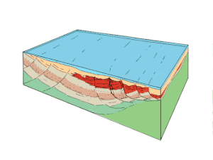 传入近岸的波浪,因水深变浅而变形,水质点向岸运动的速度大于离岸运动的速度,形成近岸流。近岸流作用产生水体向岸输移和底部泥沙向岸净输移。在波浪斜向逼近海岸时,破波带内则产生平行于海岸的沿岸流动。这样,由向岸的水体输移和由此产生的离岸流、沿岸波浪流、潮流构成了近岸流系。此流系海水的流动所产生的泥沙强烈交换,形成一系列海岸堆积地貌。