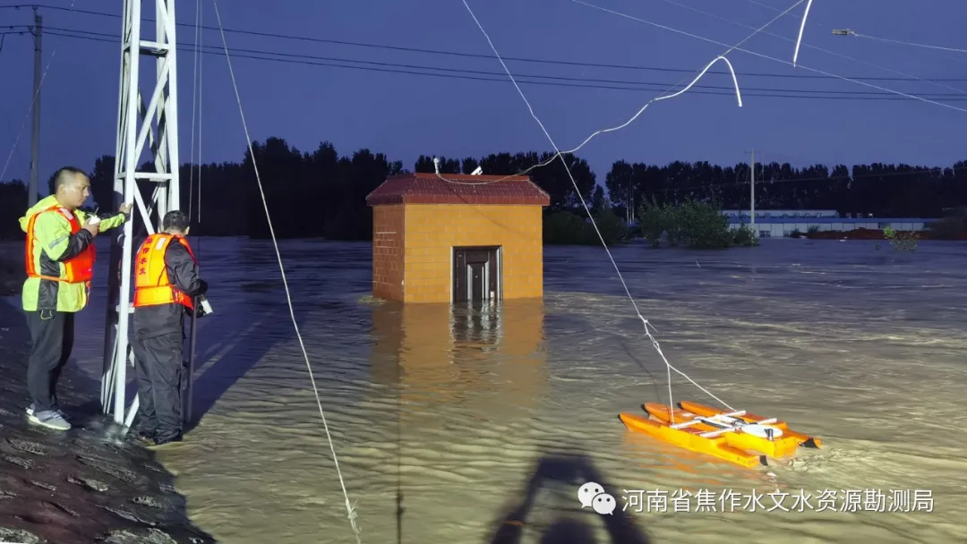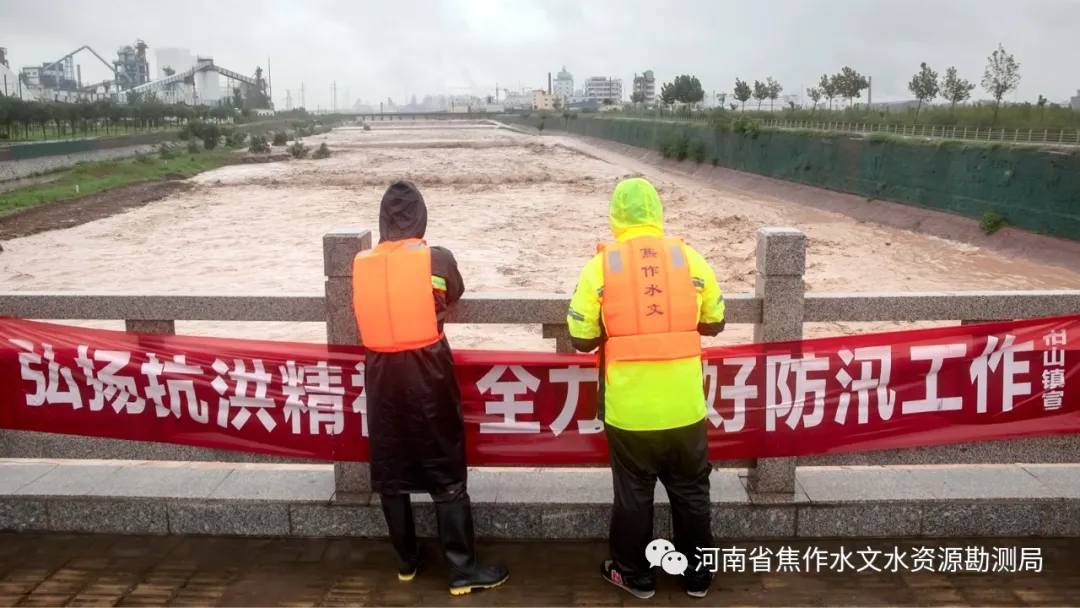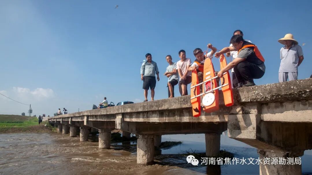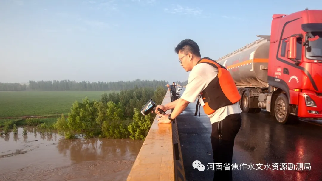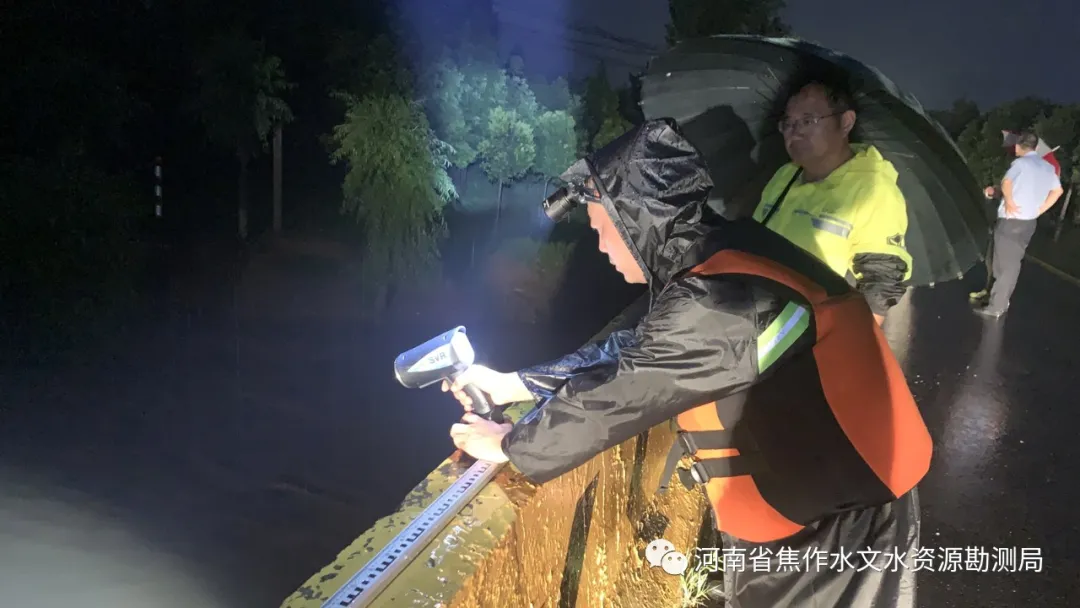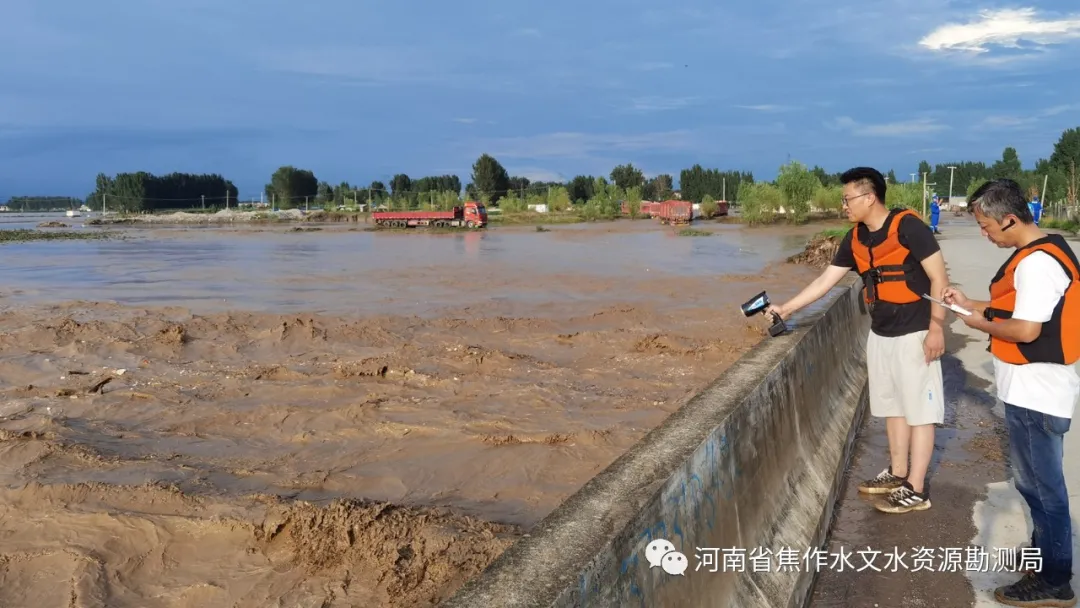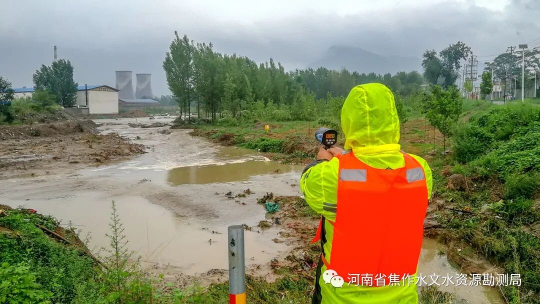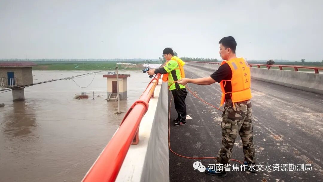 R: N. {* v: O 暴雨初练兵 7月11日(周日)5时,小雨起。8时,雨强加大,第一场暴雨正式登场。面对暴雨和汛情,局长吴庆申第一时间进行周密部署,要求焦作水文局全员到岗,全面检查缆道、流速仪、发电机、电波流速仪、ADCP(声学多普勒流速剖面仪)等应急监测设备,所有车辆加满油,确保随时出发测报洪水。7月11日11时,雨势减缓,稀稀拉拉滴过了午饭时间。刚过15时,暴雨再次来袭,两路水文应急测报突击队冒雨出动。吴庆申带领由党员组成的突击队,奔赴丹河的闪拐巡测站,由于丹河公路桥高、距水面较远,他们赶到闪拐上游的双磨村农用桥。此时洪水几近桥面,似乎触手可及,交警拉出了警戒线,汽车和行人全部禁行。整棵的树木、巨型的储罐桶,不断撞击着桥面咚咚作响,令人不寒而栗、胆战心惊。突击队顾不得危险,从桥的两头同步开始,用手持电波流速仪测流速,读水位求断面算流量。每次上桥大家心里想的都是“快点再快点”,尽量减少在桥面的作业时间。直至晚上9时洪水回落,共测洪五次,实测最大流量为666立方米每秒。2 V% ~" m3 X+ Y/ G7 b2 y
