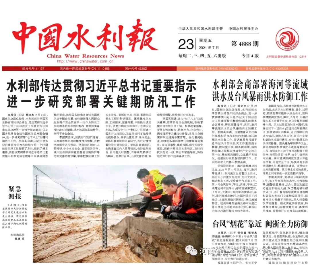 图12 《中国水利报》头版刊登焦作水文人与时间赛跑,连续经历了两场建局以来超历史大暴雨阻击战,新兵成了老兵,老兵更加历练,整体业务水平得到极大提升。7月25日晚,焦作水文局接到省水文局支援鹤壁防汛抢险的紧急通知,局领导班子迅速商议,在焦作水旱灾害防御Ⅲ级应急响应,每天三小时报一次水情,人员紧缺的情况下,抽调6名同志组成应急测报突击队,在吴庆申的带领下赶赴鹤壁。截至8月6日,他们全天24小时坚守一线测报,一小时报一次水位,四小时测一次流量,在新的战场上赓续“求实、团结、奉献、进取”精神,助力鹤壁打赢防汛抢险救灾保卫战,锤炼焦作水文人搏击洪流的战斗意志。