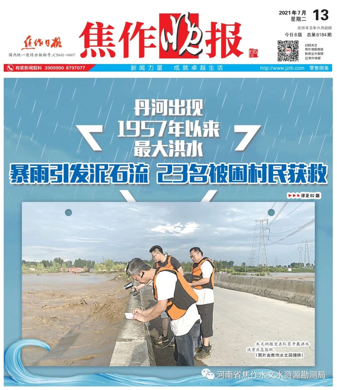 9 W5 Q1 P1 p+ h+ y6 x0 {: p 图04《焦作晚报》7月13日头版 暴雨过后,焦作水文人并没有停歇。2 m$ m9 H7 I5 _
