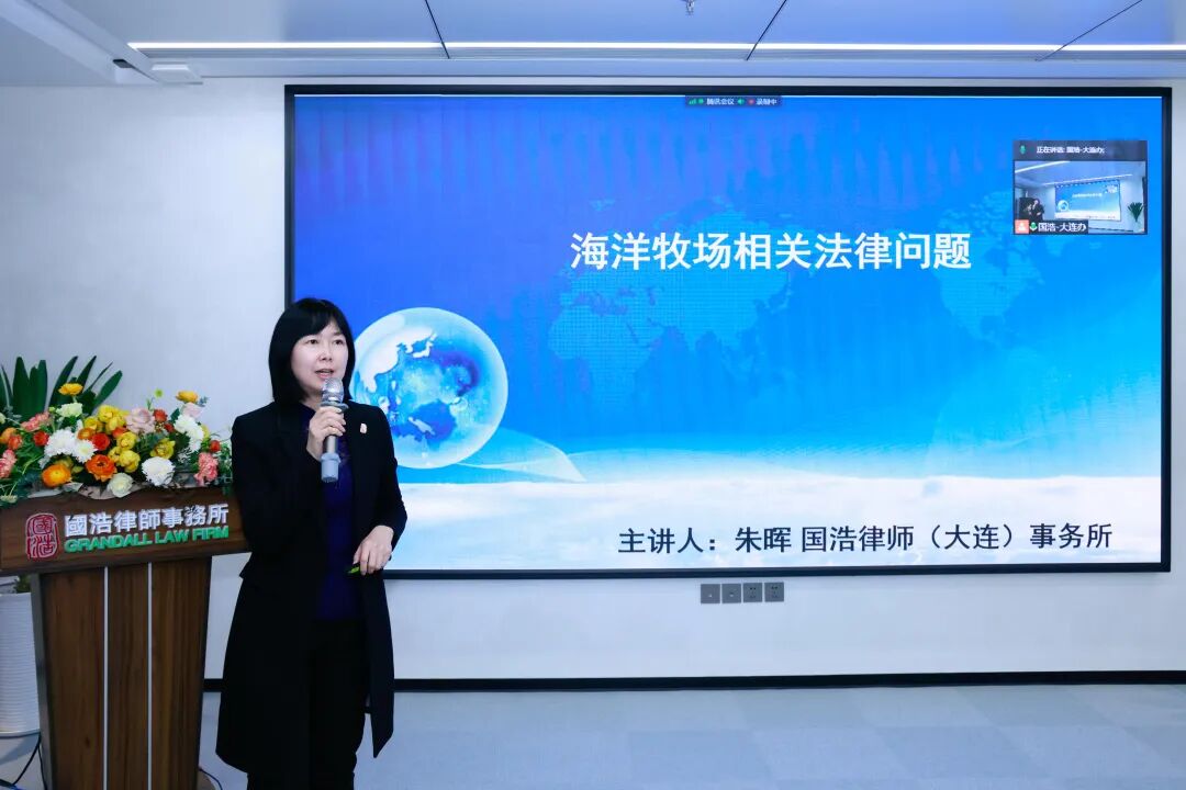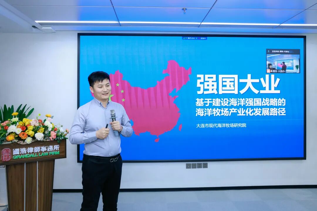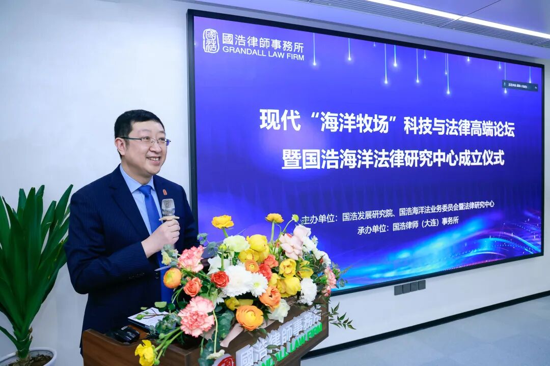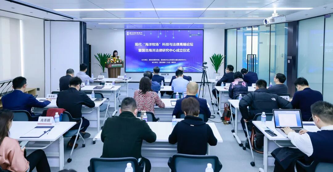 ) l0 V" i9 J/ |5 K0 T 顺风张帆掀波澜,向海图强沐春风。2022年2月11日,由国浩发展研究院、国浩海洋法业务委员会暨法律研究中心主办,国浩律师(大连)事务所承办的现代“海洋牧场”科技与法律高端论坛暨国浩海洋法律研究中心成立仪式在大连成功举办。来自海洋法相关协会、高校和研究机构等的专家学者、企业代表,以及国浩律师通过线上会议结合线下会场的方式倾情参与、共同见证,推动海洋法领域学术实务交流合作,在科技迭代中拥抱海之馈赠。