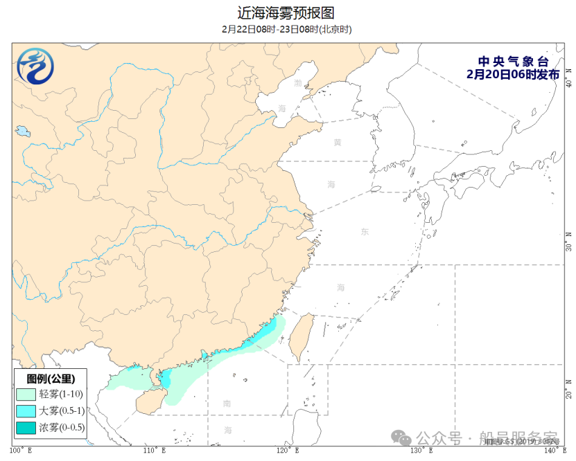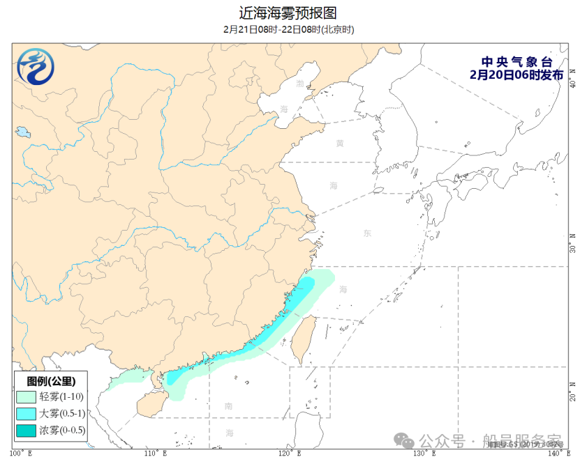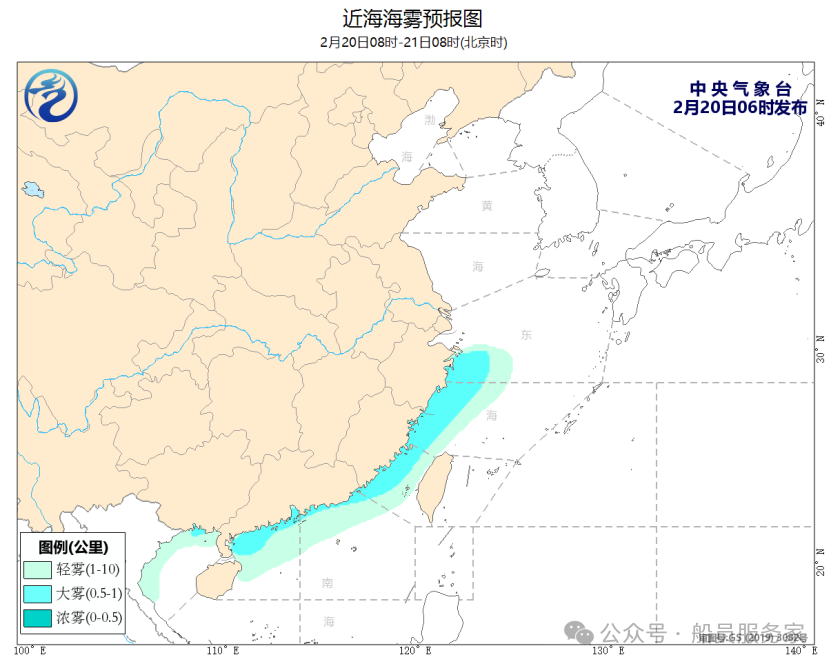* t. I, v4 d ~6 C 预计,20日白天至夜间,东海西部海域、浙闽沿岸海域、台湾海峡、广东沿岸海域、广西沿岸海域将有大雾,能见度不足1公里。为此,中央气象台2月20日06时继续发布《大雾黄色预警》。 + J8 j. z- m1 {' ]