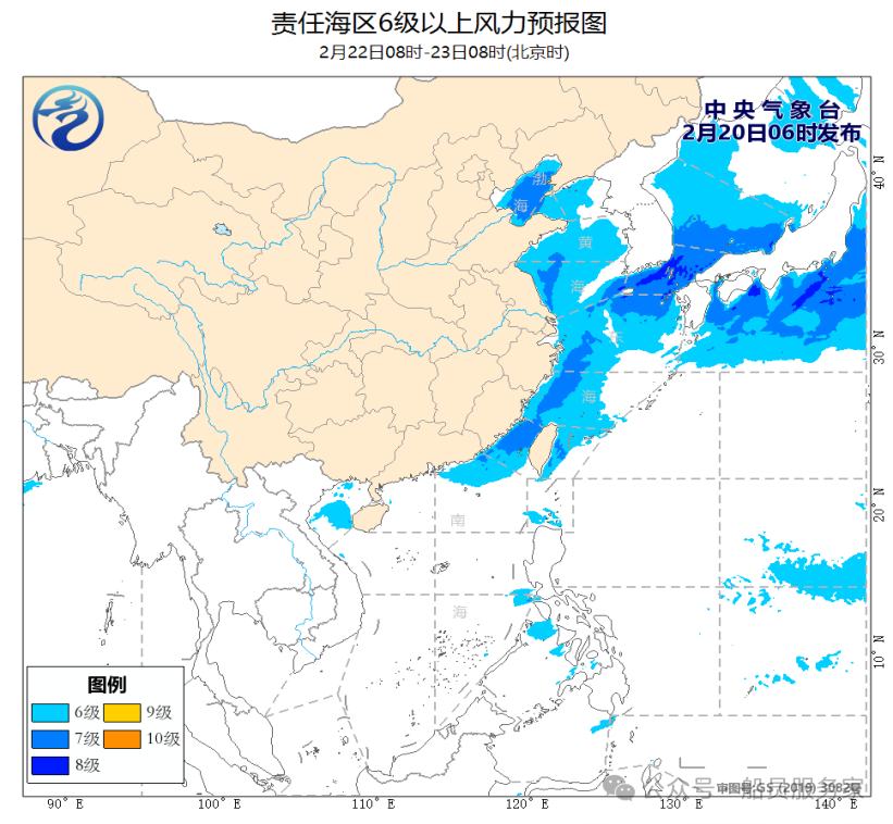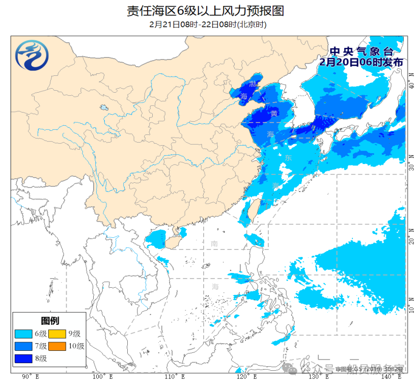 8 O: Z( L, E4 T+ t5 s$ l 预计,20日白天至22日白天,受冷空气影响,渤海、渤海海峡、黄海大部海域将有7~8级、阵风9级的大风。为此,中央气象台2月20日06时继续发布《大风蓝色预警》。另外,东海西部海域将有5~6级西南风转6~7级、阵风8级的偏北风,东海东部海域、台湾以东洋面、台湾海峡、北部湾将有5~7级、阵风8级的偏南到西南风。