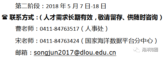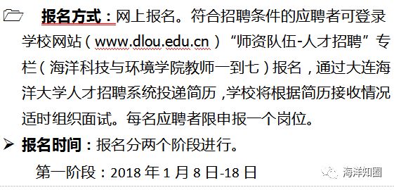 ' Y* y! \) T# ?9 o7 } (具体详情请见辽宁人事考试网<含大连海洋大学2018年公开招聘高层次人才需求>(http://www.lnrsks.gov.cn/html/kaoshidongtai/sydw_zhaopingonggao/615.html)或大连海洋大学官网(http://zzrs.dlou.edu.cn/2018/0105/c5106a71928/page.htm))