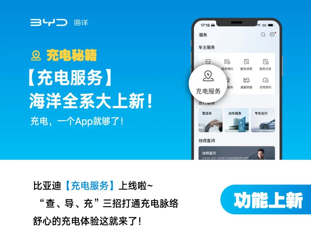 IT之家 6 月 17 日消息,比亚迪海洋汽车今日全系上新充电服务,支持“查、导、充”三大功能。 : G8 A( i4 E: }5 d- x+ Z