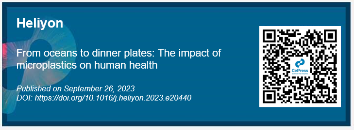 0 i5 s X. O/ O- d6 o) d/ c1 p0 z. a 微塑料,指直径小于5毫米的塑料颗粒,是一种造成污染的主要载体。事实上,微塑料的粒径范围可以从几微米到几毫米,是形状多样的非均匀塑料颗粒混合体,肉眼往往难以分辨,被形象地称为“海中的PM2.5”。由于微塑料在海洋环境中的广泛存在以及对生物产生的各种确定的以及不确定的危害,得到了各界的广泛关注。本文对微塑料与人类健康之间错综复杂的关系进行了细致的探讨,对更深层次地理解微塑料与人体系统相互作用机制起到促进作用。2023年9月26日,这篇文章以“From oceans to dinner plates: The impact of microplastics on human health”为题,发表Cell Press细胞出版社期刊Heliyon上。