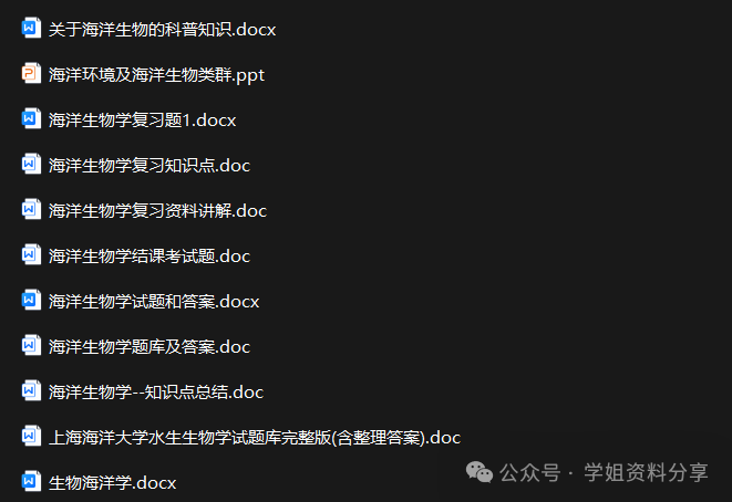 + a! `- e1 v# N) ~+ @) j D: D  学姐今天要分享的就是海洋生物学这门课程,这门课的主要资料包括了重点知识点整理+笔记总结+试题题库答案解析+名词解释+思维导图+电子版pdf。9 G# ^9 O6 x: K: I" i( \