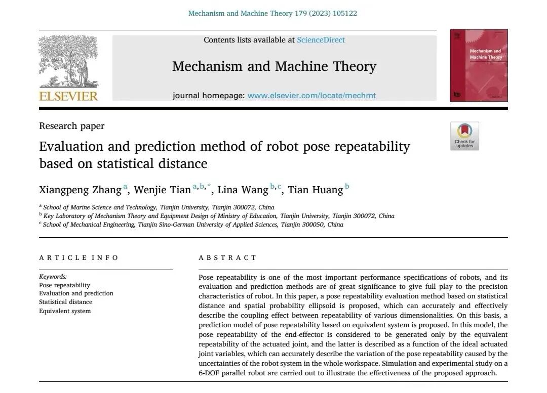 2023年1月,天津大学海洋学院田文杰老师研究团队在机器人学顶级期刊《Mechanism and Machine Theory》(SCI 1区Top)上发表一篇题为“Evaluation and prediction method of robot pose repeatability based on statistical distance”的研究论文。