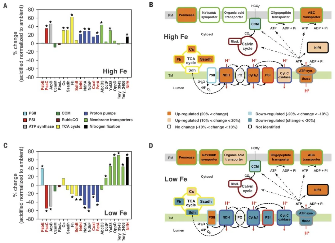 $ U1 S& j: X5 F5 v8 G( u0 Q$ T* ~3 ] (A and C) Percentage change (acidified normalized to ambient condition) (table S4) of abundance of key proteins involved in photosynthesis, energy generation, carbon fixation, cytosolic pH homeostasis, and N2-fixation in T. erythraeum at high (~925 pM Fe′) and low (~35 pM Fe′) Fe concentrations in 20 μM EDTA-buffered natural seawater Aquil-tricho medium. Data are mean of three biological replicates (n=3; error bars not shown). Asterisks denote significant changes in protein abundance in response to acidification (fold changes of ≥1.2 or ≤0.83 with 5% false discovery rate cutoff, Student’s t test followed by Benjamini-Hochberg correction). Fe-containing proteins are denoted by names in red. (B and D) Schematic representation of the functions of the proteins quantified in (A) and (C), respectively, and of their change in abundance in response to acidified condition at high and low Fe concentrations. Colors at the periphery of the protein pictograms correspond to bar colors in (A) and (C), and those in the center indicate the extent of up- or down-regulation of these proteins. PM, plasma membrane; TM, thylakoid membrane.