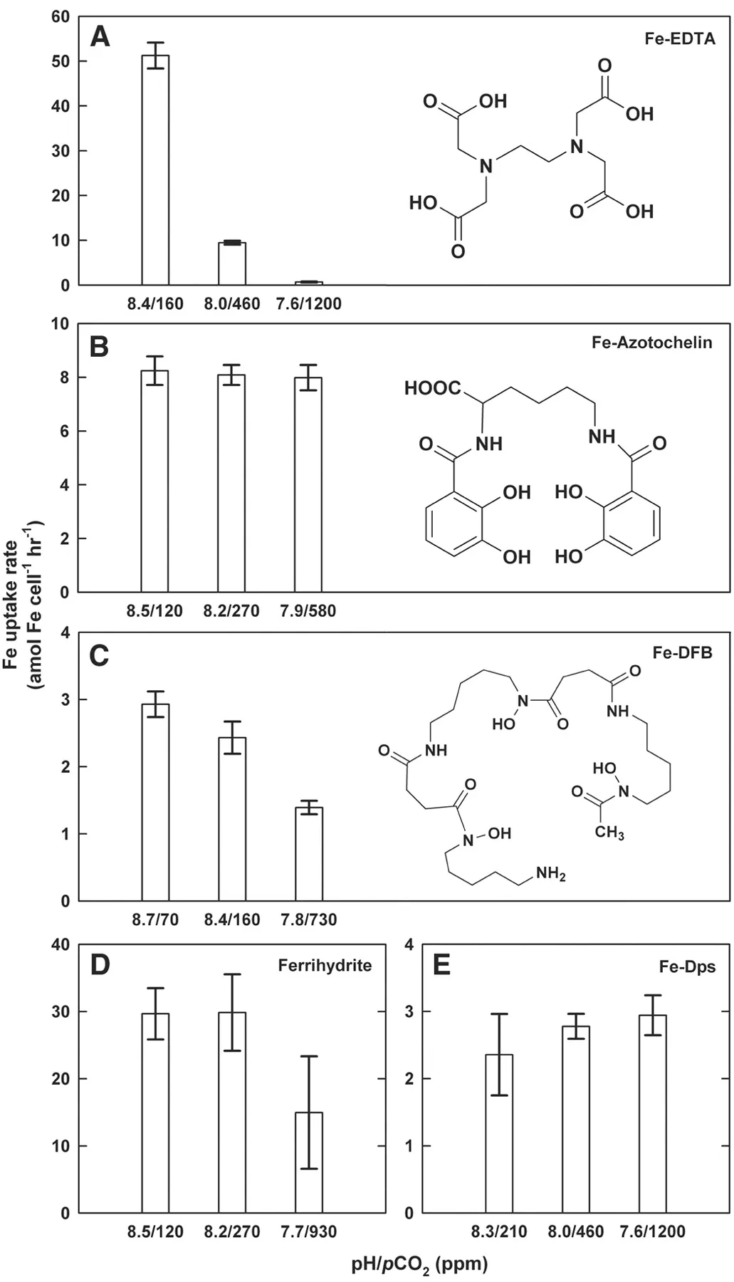 Short-term Fe uptake by iron-limited T. weissflogii from iron bound to three chelators, (A) the aminocarboxylate EDTA, (B) the biscatecholate siderophore azotochelin, and (C) the trihydroxamate siderophore desferri-ferrioxamine B, and from iron in the forms of (D) freshly precipitated ferrihydrite and (E) ferrihydrite sequestered in the iron storage protein Dps at three different pH/PCO₂. Error bars represent the SD of biological replicates (n = 2 replicates).