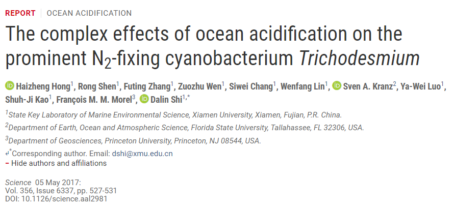 ' g- \" Y9 ]. a* L+ c 4. 2017年,Science期刊发表的题为“The complex effects of ocean acidification on the prominent N2-fixing cyanobacterium Trichodesmium”的文章。 4 G( \: S i! g+ @: w. }# k3 s