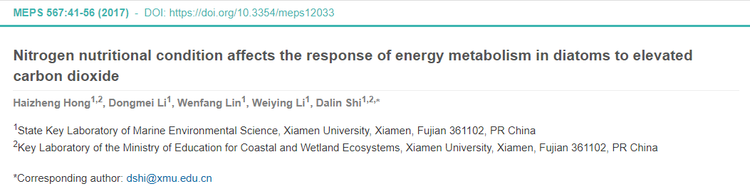 5. 2017年,Marine Ecology Progress Series期刊发表的题为“Nitrogen nutritional condition affects the response of energy metabolism in diatoms to elevated carbon dioxide”的文章。
