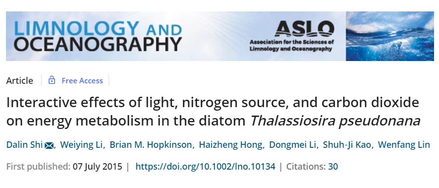 3. 2015年,Limnology and Oceanography期刊发表的题为“Interactive effects of light, nitrogen source and carbon dioxide on energy metabolism in the diatom Thalassiosira pseudonana”的文章。