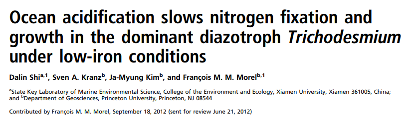 2. 2012年,PNAS期刊发表的题为“Ocean acidification slows nitrogen fixation and growth in the dominant diazotroph Trichodesmium under low-iron conditions”的文章。 9 J, J/ S$ a: o