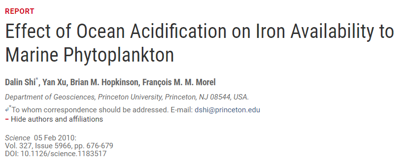 ; D- W3 A7 g3 `: h i* n 1. 2010年,Science期刊发表的题为“Effect of ocean acidification on iron availability to marine phytoplankton”的文章。 ( r# B A {2 U2 K {" u8 A