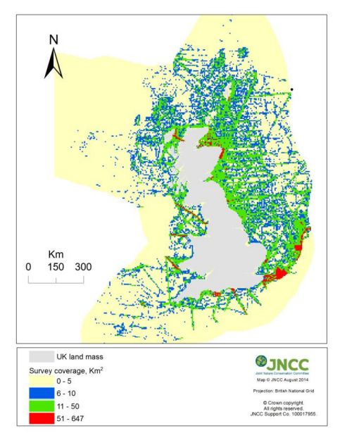 图6(2) 海上样线调查(© JNCC,左下是英国的海上样线覆盖,右下图是物种数量累计。)