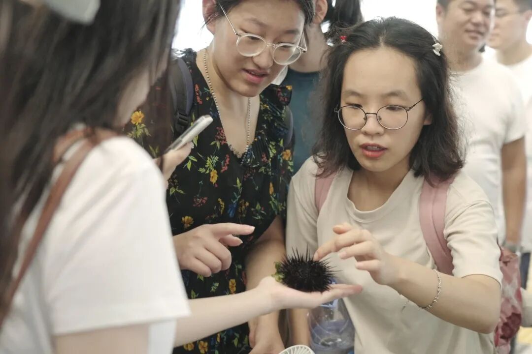 % m" V7 k0 ]8 G; | 支队成员观察培育过程中的海胆 * c/ ]) R6 q8 l2 N: N2 f) d