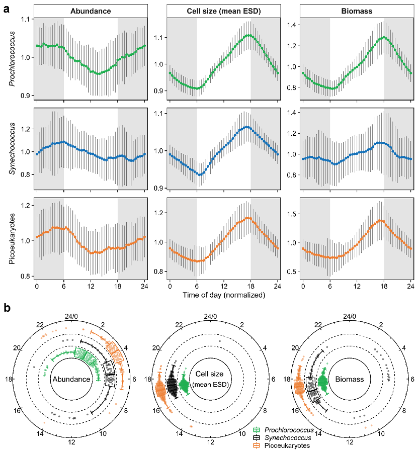 ' \( o* ^; ? ]) i7 b3 @! A! X 图3: 南海夏季航次观测与SeaFlow数据集的联合分析 (a): 全部38个航次每半小时平均的三个类群的微微型浮游植物细胞数量、细胞大小和生物量的变动。此处数值已经标准化,因而它们是无单位的,并围绕1上下波动。(b): 环形箱形图与beeswarm图相结合显示三个类群的微微型浮游植物细胞数量、细胞大小和生物量的昼夜周期变动峰值时间的分布。每个点对应一个具有显著昼夜变动的有效日。
