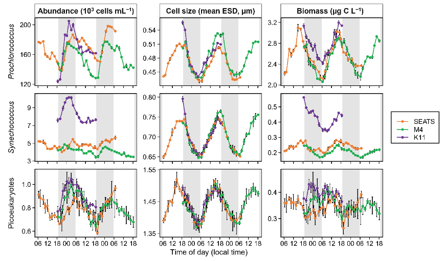 ) U; _% v& x+ U 近日,厦门大学近海海洋环境科学国家重点实验室黄邦钦教授研究团队以“Quasi-antiphase diel patterns of abundance and cell size/biomass of picophytoplankton in the oligotrophic ocean”为题在Geophysical Research Letters期刊上发表最新研究成果,证实并扩展了先前关于寡营养海域中微微型浮游植物的昼夜周期变化的研究结果,进一步指出微微型浮游植物细胞丰度与细胞大小/生物量呈现的准反相昼夜变化关系很可能是近稳态寡营养生态系统的一个普遍特征。 ; J5 S3 T6 o0 M' C. g* [