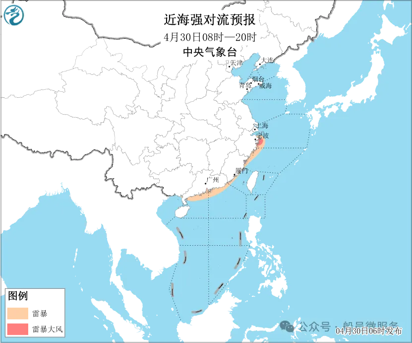 预计,30日白天,浙江沿岸部分海域将有8~10级雷暴大风。